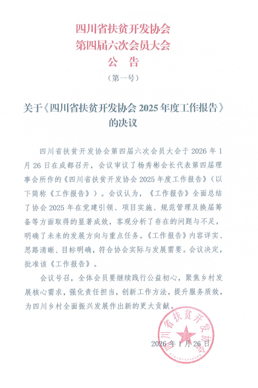关于《四川省扶贫开发协会2025年度工作报告》 决议的公告