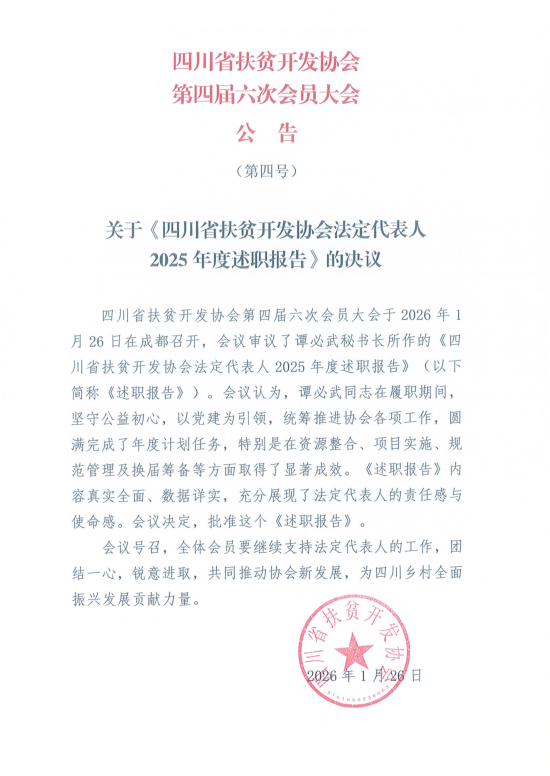关于《四川省扶贫开发协会法定代表人 2025年度述职报告》决议的公告